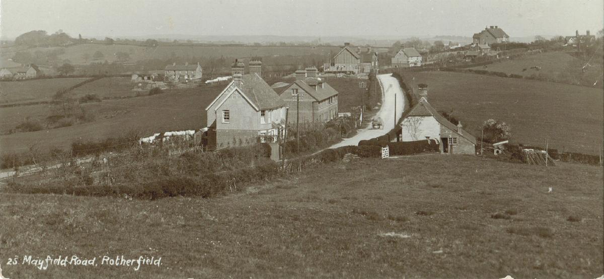 High Cross Road, Rotherfield in East Sussex, England (apparently referred to as Mayfield Road in the past). The houses in the foreground on the left side of the road are sitting on land known as Drapers which was owned by the Barbers c1530 - 1787. (Postcard in private collection of Geoffrey Barber)