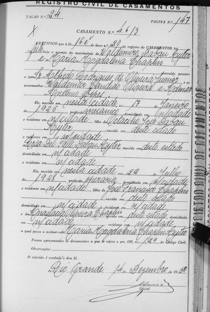 Marriage of Maria Magdalena Chaplin, on December 14, 1950, to Waldomiro Dabau Ayter.