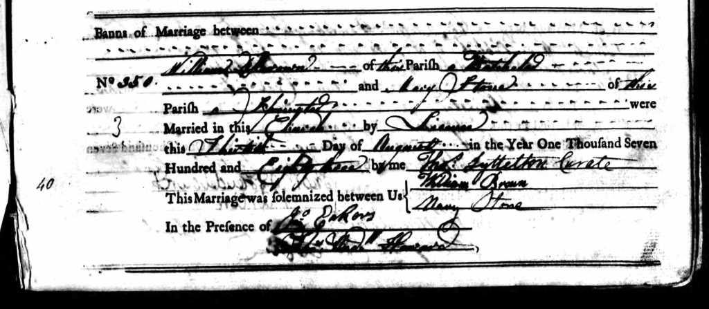 Marriage record for William Brown and Mary Stone at Limehouse St Anne's in London, Middlesex on 30 August 1783.