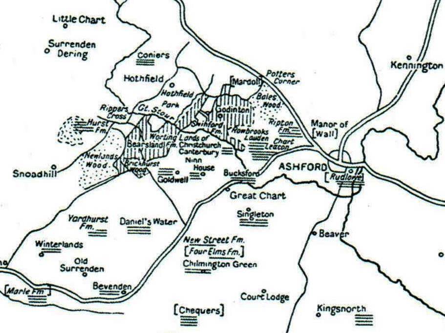 Sketch map showing the location of Ninne House in Great Chart (near Ashford), Kent.