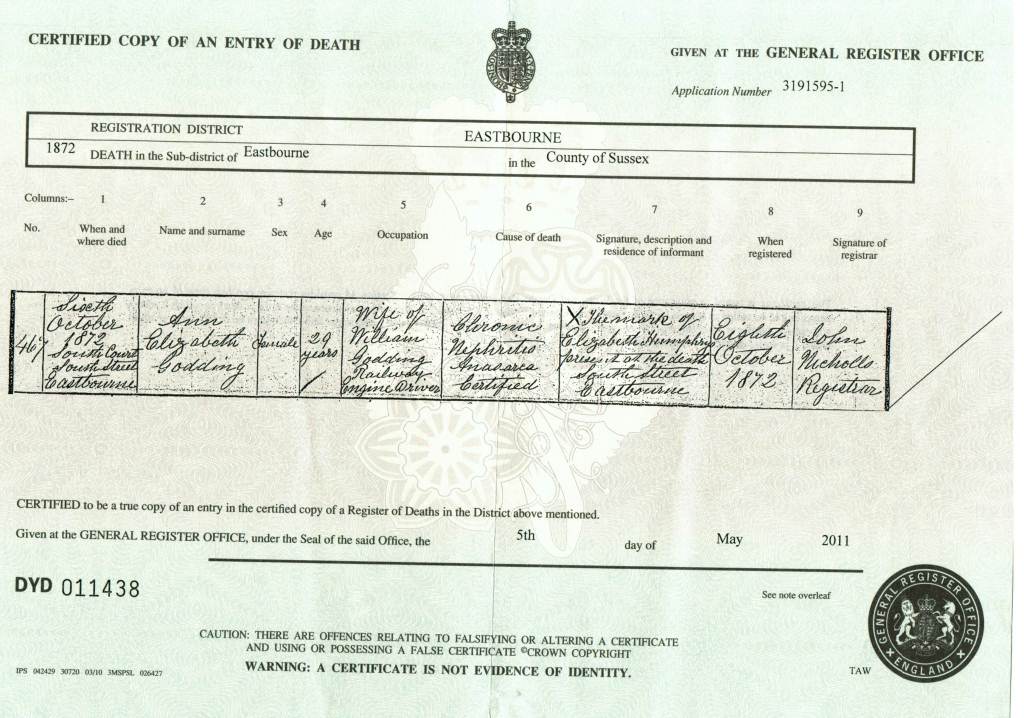 Death Certificate of Ann Elizabeth Godding 1872