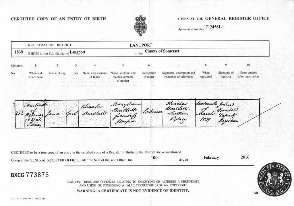 Birth certificate for Jane Bartlett, 14 February 1839.