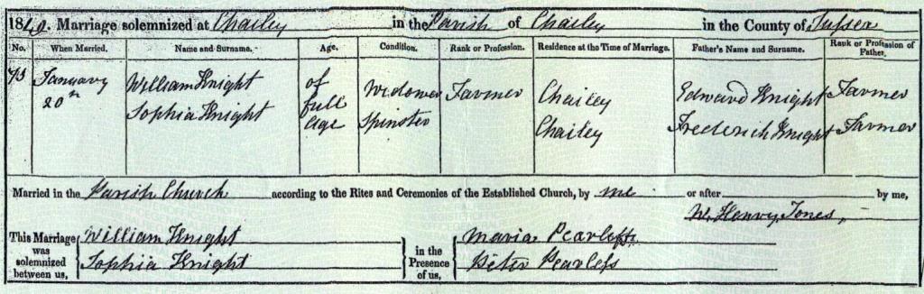 Marriage certificate for William Knight and Sophia Knight, 20 January 1849 at Chailey, Sussex.
