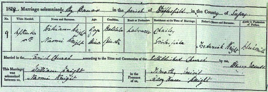 Marriage certificate for William Knight and Naomi Knight, 9 September 1839 at Wivelsfield, Sussex.