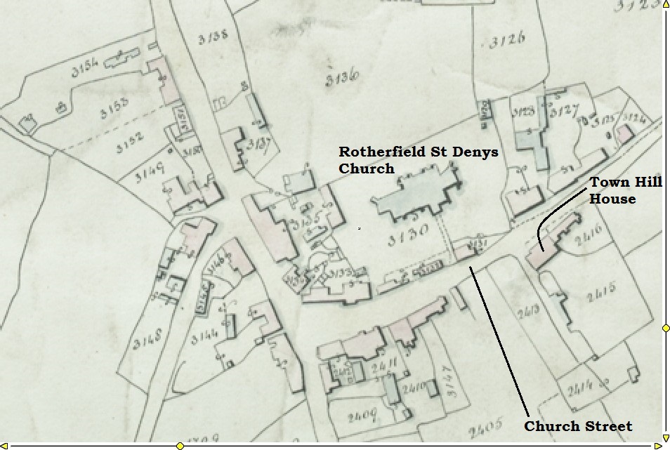 The 1842 Tithe Map of Rotherfield Village. The Rotherfield St Denys church is clearly shown in plot 3130. The property Bachelands is plot 2413 and Bonnetts comprises plots 2414, 2415 and the Way. (ESRO, TD/E 1560006)