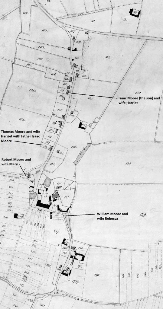 The 1843 tithe map showing properties occupied by Isaac Moore's sons Isaac (plot 113), Thomas (plot 123), William (plot 142, shared with William Verrall) and Robert (plot 141¾, shared with William Hudson). Isaac (the father) was living with Thomas (plot 123) at the time of the 1841 census.