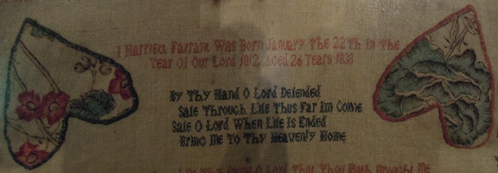 Harriet Gladman's birth recorded on her embroidered bed cover.