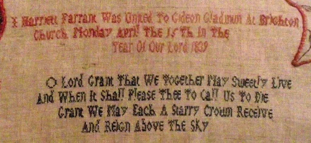 Gideon Gladman and Harriet Farrant's marriage recorded on Harriet's embroidered bed cover.