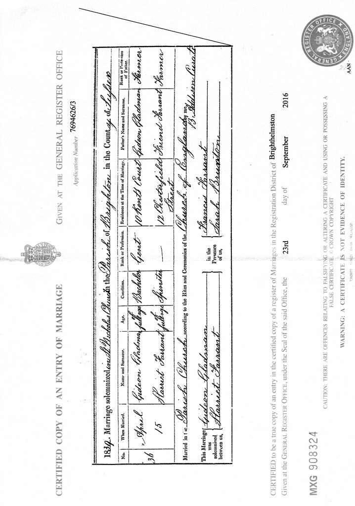 Marriage Certificate for Gideon Gladman and Harriet Farrant, 15 April 1839 at Brighton, Sussex.