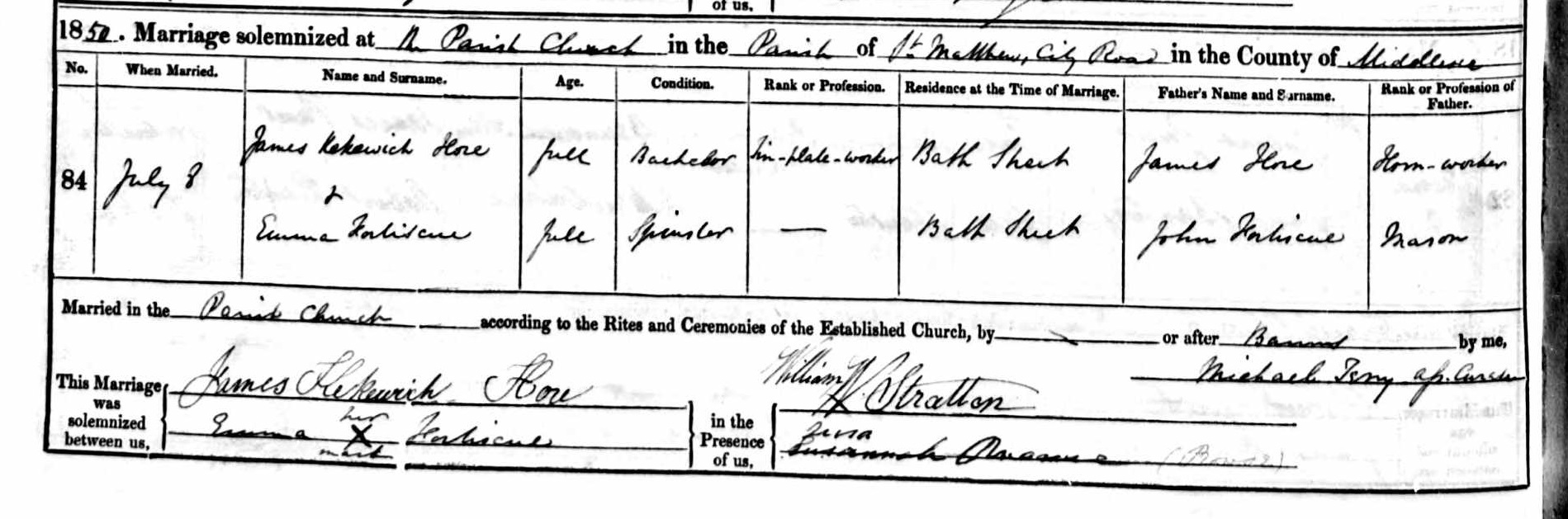 Entry in the church register for the marriage of Emma Fortescue and James Kekewick Hoare, 8 July 1850.
