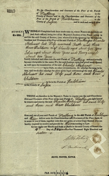 Removal Order for Charles and Ruth Akehurst and family, 10 Dec 1816.