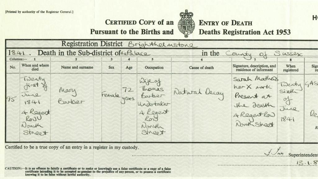 Death Certificate of Mary Barber 1841