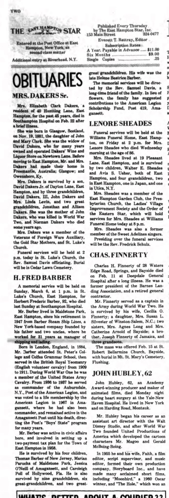 Obituary for Herbert Frederic Barber, 24 February 1977, East Hampton Star.