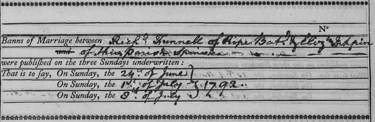 Marriage banns for RichardFunnell and Elizabeth Inkpin, 1792 at Laughton, Sussex, England.