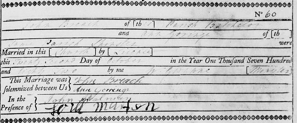 Marriage of John Breach and Ann Goringe, 22 Oct 1782 at Hamsey, East Sussex.