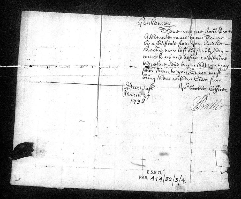 Letter from Overseers of the Poor at Burwash, 27 March 1738.