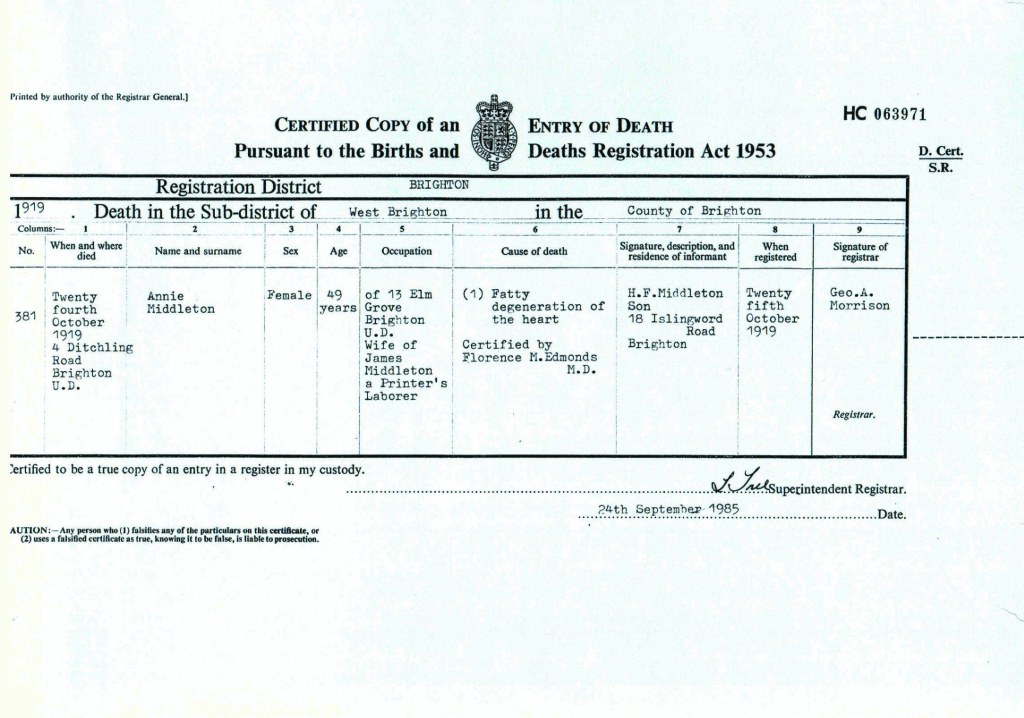 Death Certificate of Annie Middleton 1919