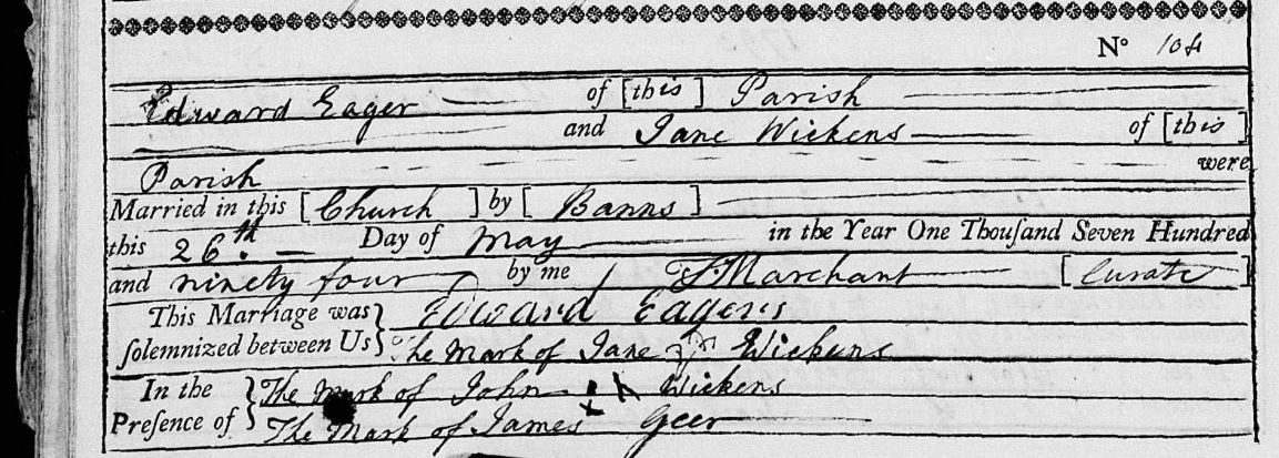 Marriage register entry for Jane Wickens and Edward Eager, 26 May 1794 at Clayton.