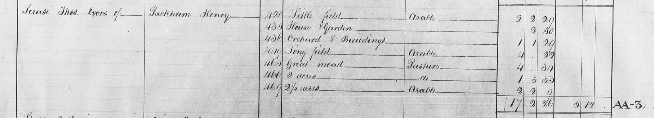 The tithe schedule for Henry Packham's farm showing the plots he occupied, their names and usage, acreage and annual tithe of £5 12/s.