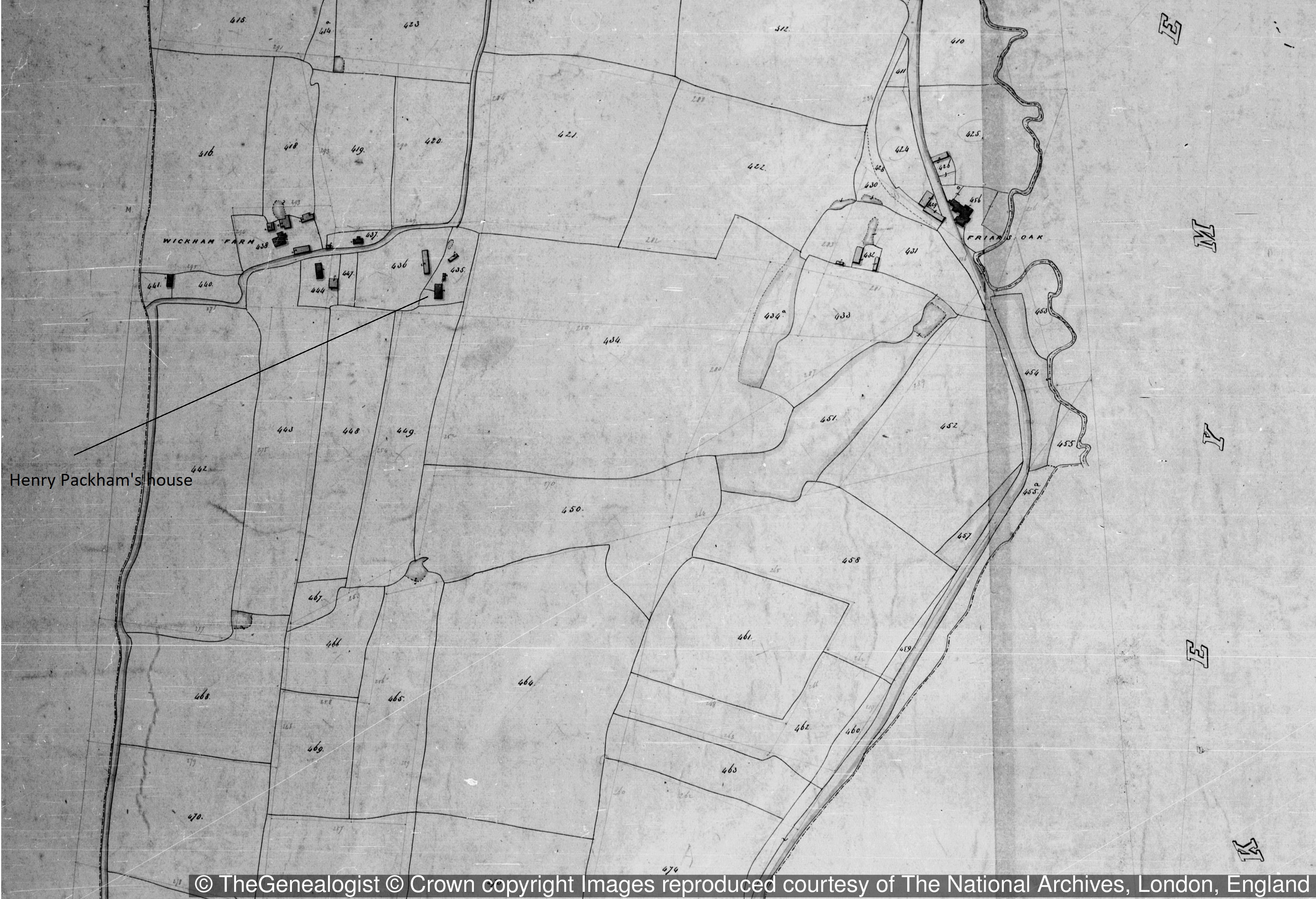 Henry Packham's farm on the 1838 Tithe map in the hamlet of Wickham in the parish of Clayton in East Sussex (the hamlet is now called Hurst Wickham).