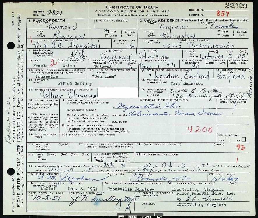 Death certificate: Kate Jeffery Stevens, 1951.