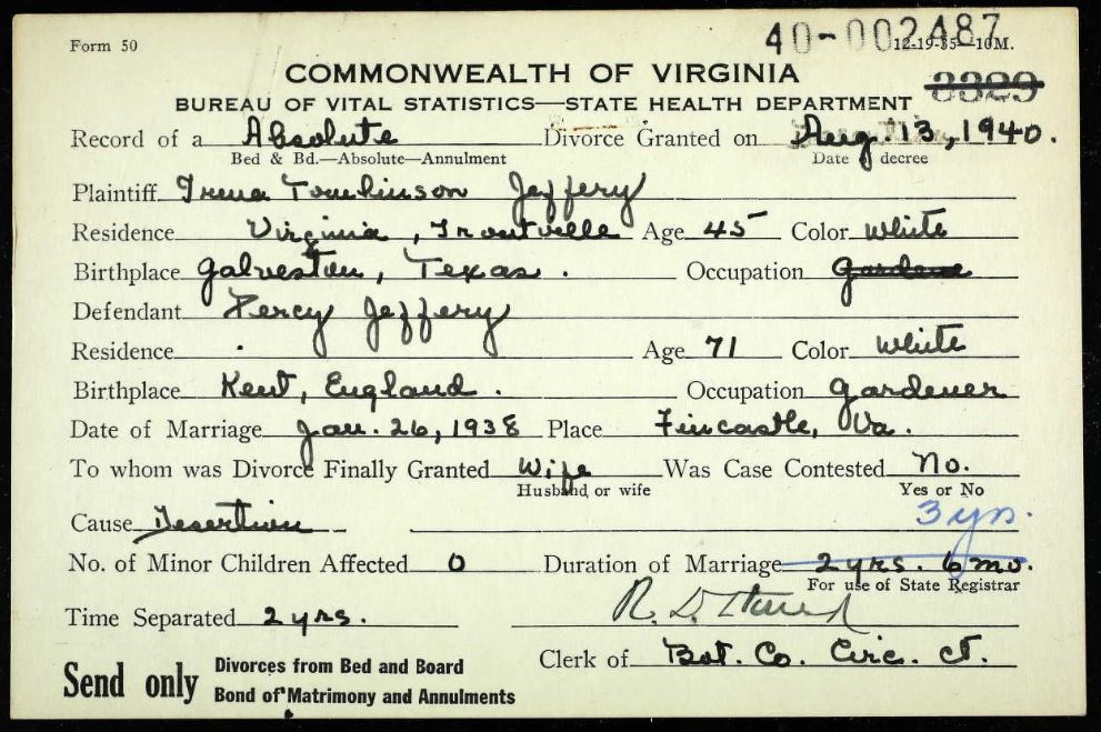 Divorce: Percy Jeffery and Irma Jeffery, 1940.