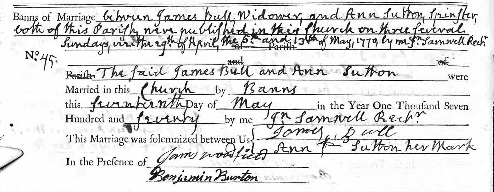 Marriage of James Bull and Ann Sutton, 17 May 1770 at Helmdon, Northamptonshire.