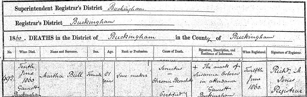 Death certificate for Martha Bull died 10 Jun 1860 at Gawcott, Buckinghamshire.