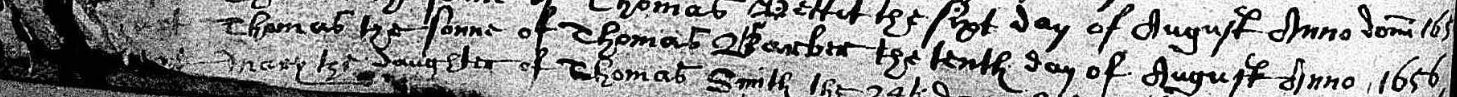 Baptism for Thomas Barber, 10 August 1656 at Ticehurst, Sussex.