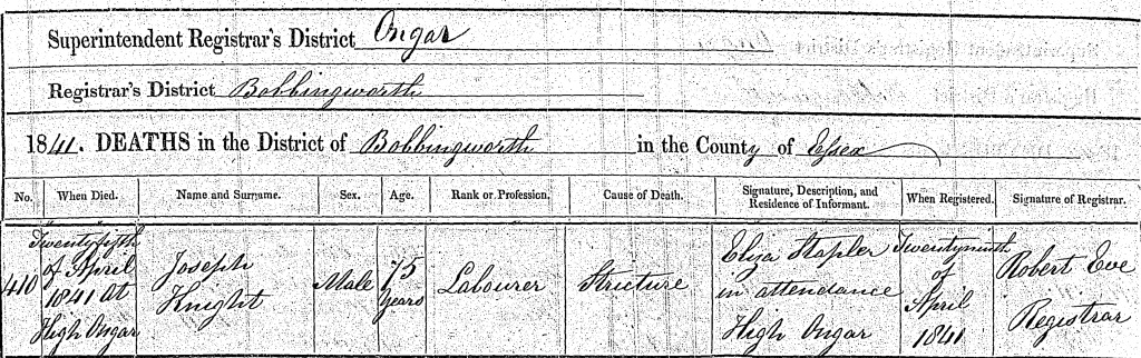 Death certificate for Joseph Knight, 25 April 1841.