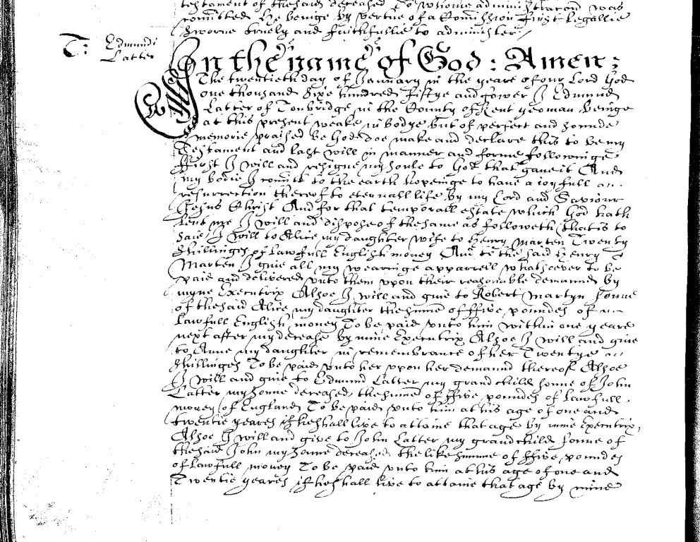 Will of Edmund Latter of Tonbridge, made 20 January 1654 - page 1.