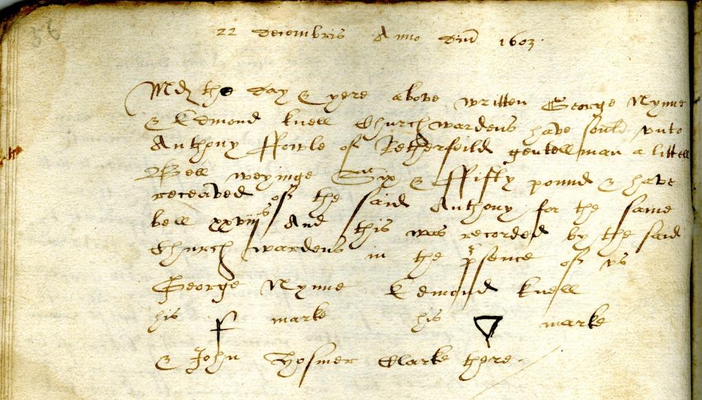 Entry from the churchwardens' account book 1603 regarding the sale of a bell (with George Nynne’s mark).