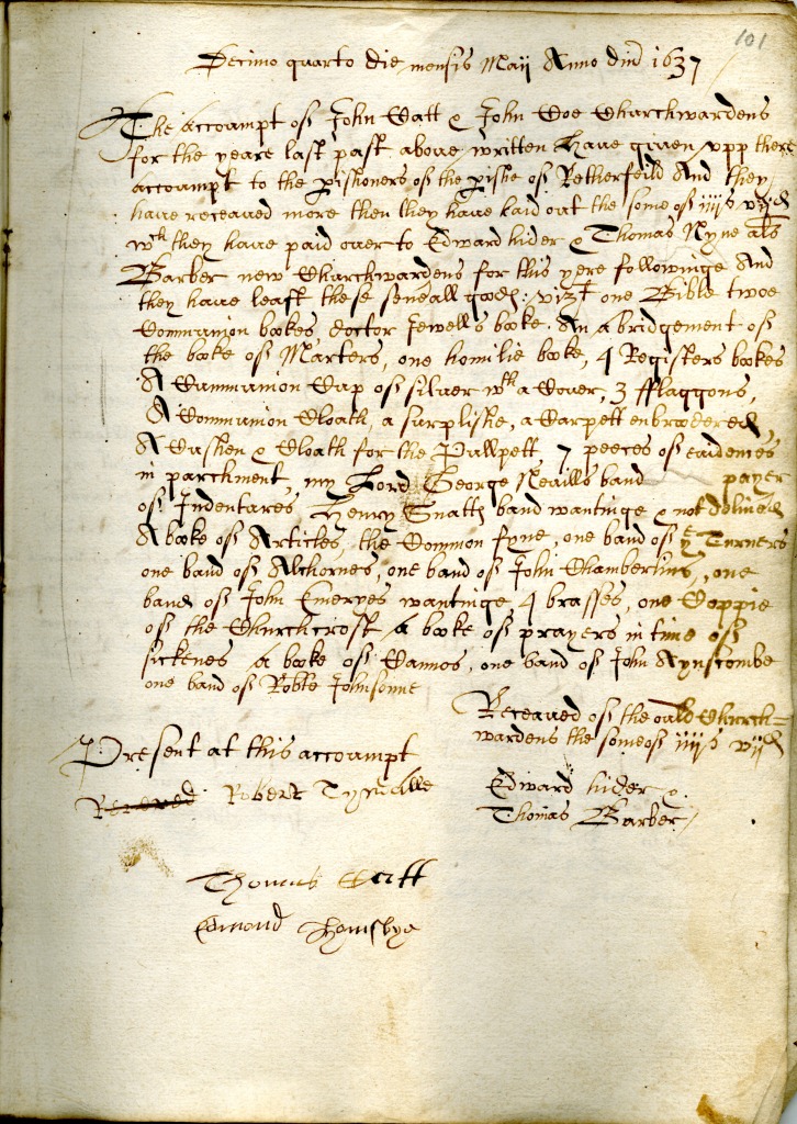 The appointment of Thomas Nynne alias Barber as churchwarden, 1637 (ESRO: PAR 465-10-3-1-p 101).