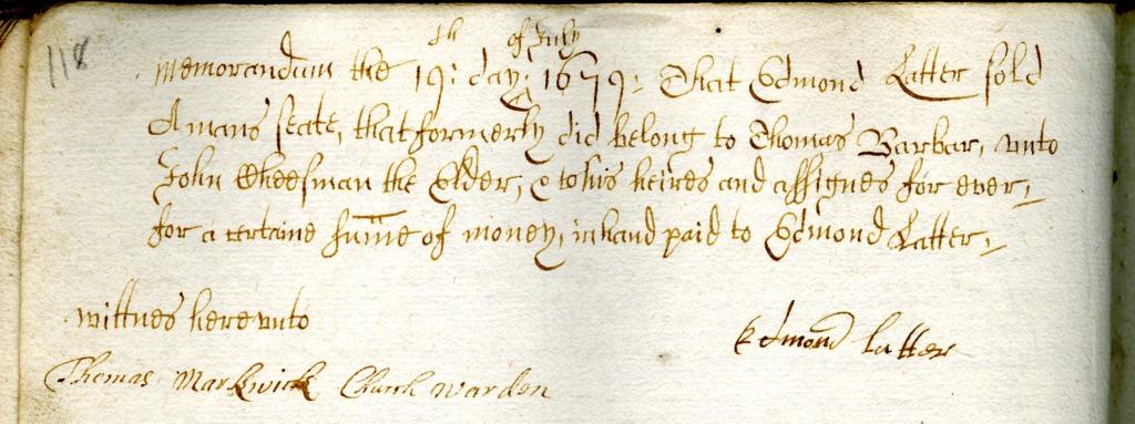Churchwardens' accounts book 1679 showing sale of a church seat previously belonging to “Thomas Barbar”.