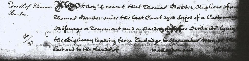 Datchurst manorial court roll 19 October 1758 posthumously confirming the succession of Thomas's father to the property held by his uncle who had died in 1749, and that the infant Thomas would be his heir (page 1).