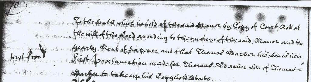 Datchurst manorial court roll 19 October 1758 posthumously confirming the succession of Thomas's father to the property held by his uncle who had died in 1749, and that the infant Thomas would be his heir (page 2).