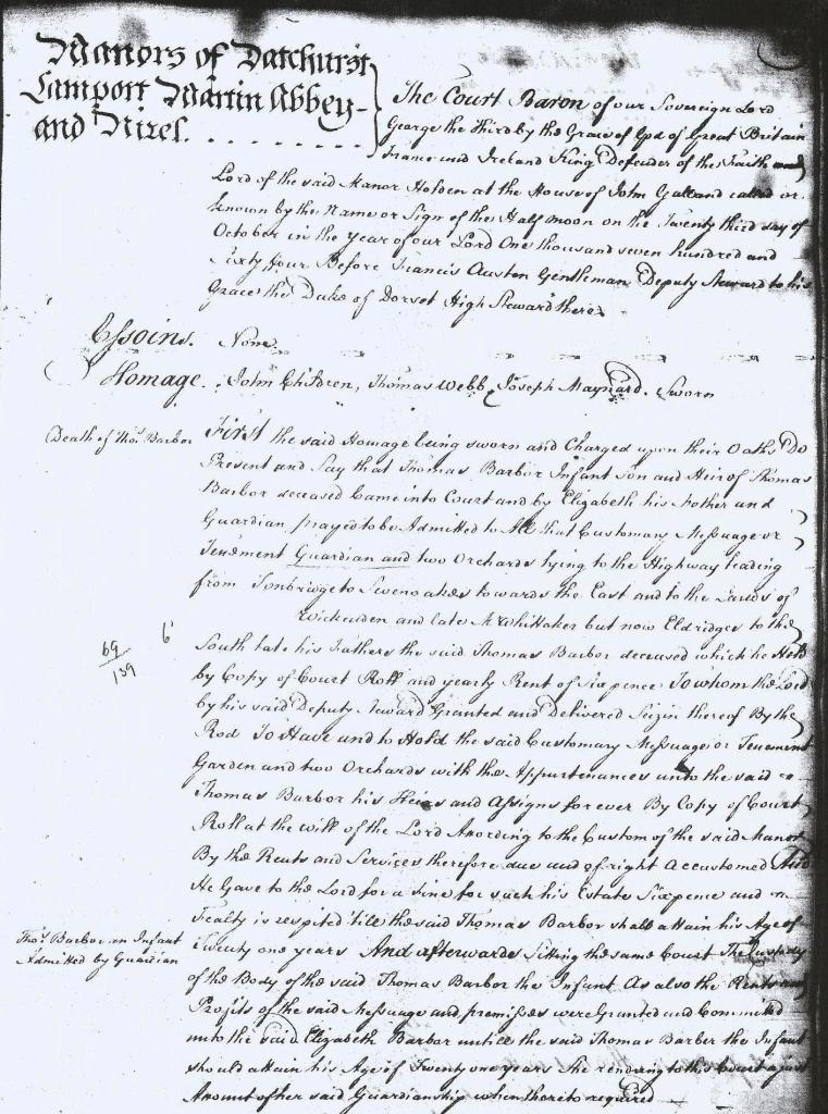 The Datchurst manorial court roll for 23 October 1764, where the infant Thomas Barber (that is, aged under 21 years) came to the court with his mother Elizabeth and prayed to be admitted to that messuage or tenement, garden and two orchards, previously held by his father Thomas Barber who had died.