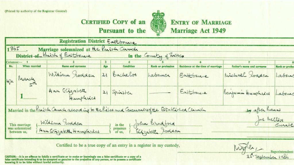 Marriage Certificate of William Godden and Ann Elizabeth Humphries 1865