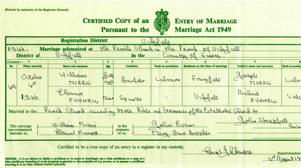 Marriage Certificate of William Morris and Eleanor Funnell 1846
