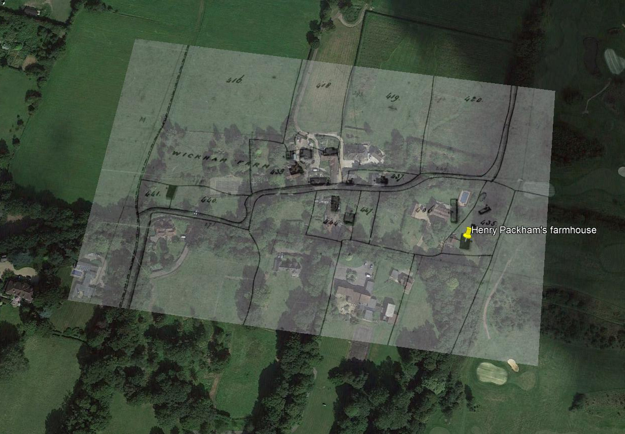 1838 Tithe map overlayed on Google Earth showing Henry Packham's farm house.