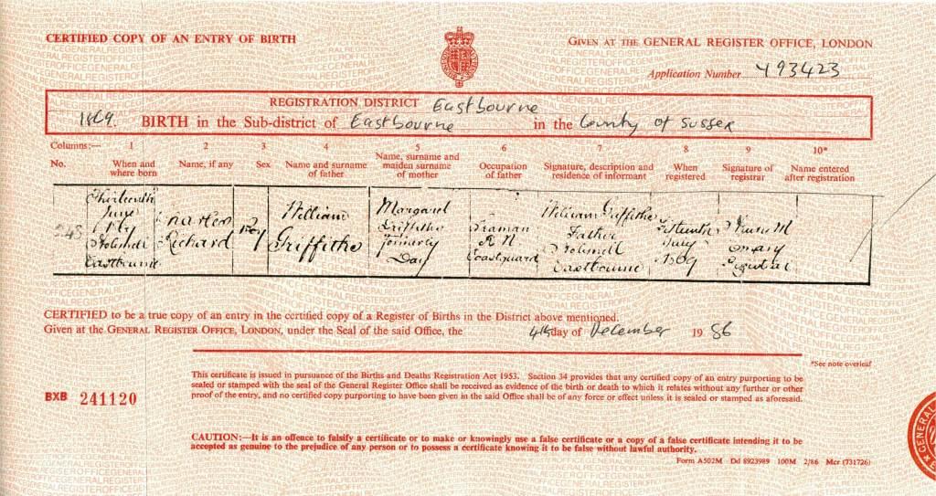 Birth Certificate of Charles Richard Griffiths 1869