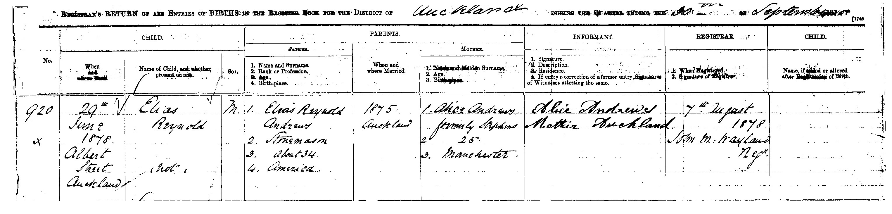 Birth certificate for Elias Reynold Andrews, 29 June 1878.
