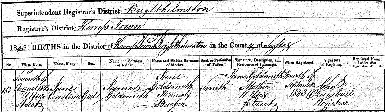 Birth certificate for Jane Caroline Goldsmith, 7 August 1843.
