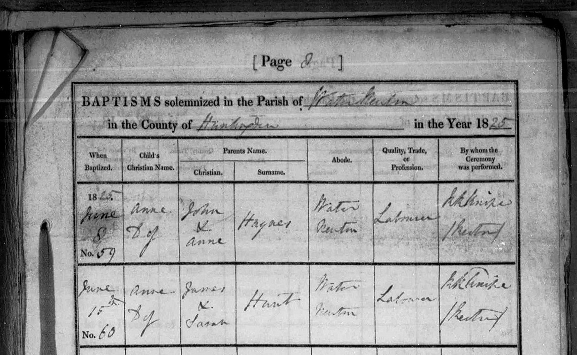 Baptism of Anne HUNT on 15 June 1825 at Water Newton.