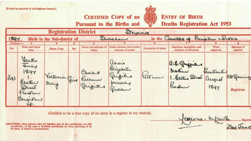 Birth Certificate of Victoria May Griffiths 1897