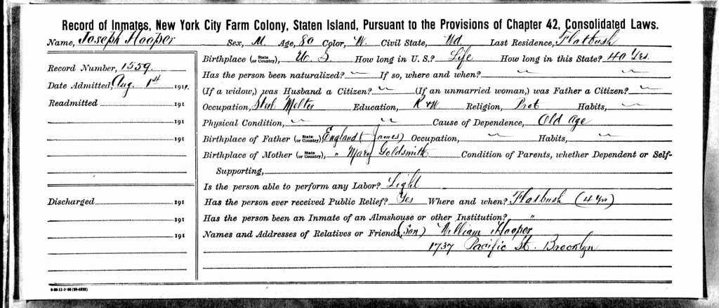 Joseph Hooper NY Census of Inmates in Almshouses and Poorhouses 1911