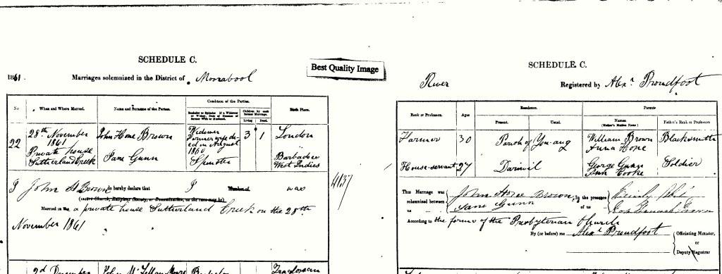 Marriage Certificate for John Hone Brown and Jane Gunn, 28 Nov 1861