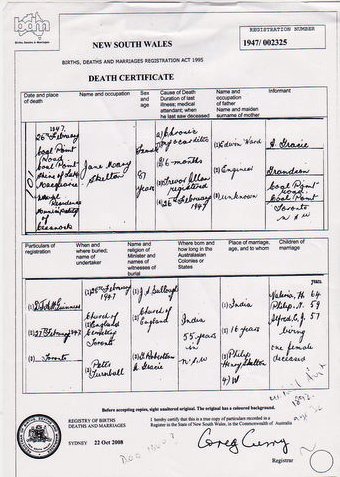 Death Certificate for Jane Mary Skelton, 26 February 1947