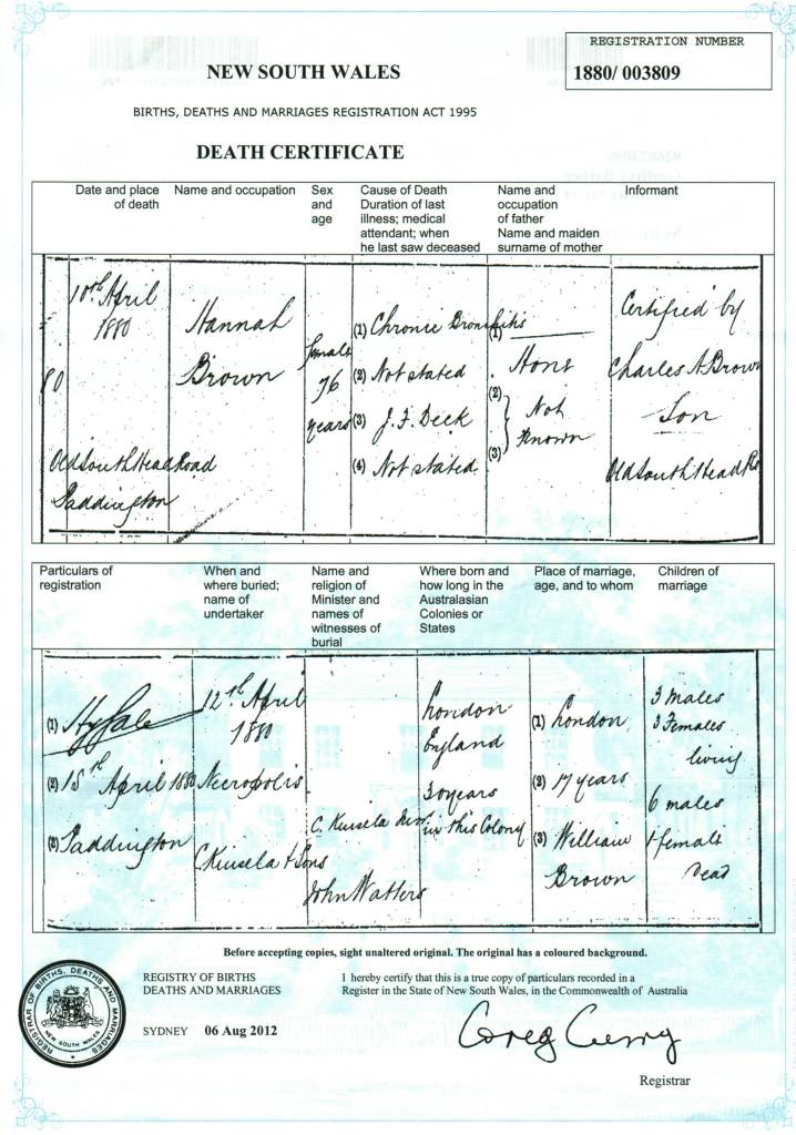Death Certificate for Hannah Brown (nee Hone), 10 April 1880