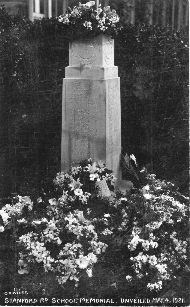 Postcard of the Stanford Road School war memorial when it was opened on 4 May 1921